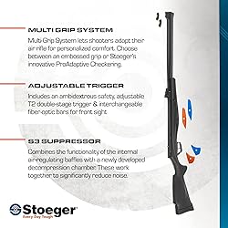 - Stoeger introduces the next generation of airgun technology in its fast-shooting, hard-hitting, yet quiet S4000-E. It comes with multiple features to customize the fit and feel, including MGS and ProAdaptive Checkering technologies. The integrated S3 suppressor dramatically reduces shot noise. A recoil-absorbing buttpad makes shooting a joy. Other features include an ambidextrous safety, adjustable two-stage trigger, and interchangeable fiber-optic bars for the front sight. The rifled barrel teams with the included scope to deliver impressive accuracy shot after shot. Step into the future of air guns with S4000-E.