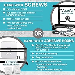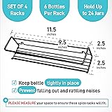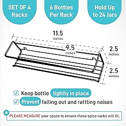 ORGANIZATION IS KEY. Use this set of wall mounted spice rack organizer in your kitchen to keep spices organized and accessible or in the garage, bathroom, closet, craft room, under the sink or anywhere. FIT UP TO 24 SPICE JARS. Since each wall mountable spice rack is hung separately, decide how much space between the racks you need for spice jars or other supplies. Hang them closer or further apart for small or large kitchen items. HANG ANYWHERE. With 4 single wall spice racks, mount them on your wall, inside your pantry, or cabinet or closet door. Hanging hardware is included with two screw sizes and adhesive hooks based on your needs. NEW SIZE, LESS RATTLING: Redesigned with its new measurement of 2.5x 2.5x11.5 inches, keep your spice jars more snug inside this spice wall rack and enjoy less rattling when opening the cabinet or pantry doors. IRON-MADE WITH A STYLISH BLACK FINISH - Made of sturdy material, this spice rack organizer for wall withstands the test of time (unlike plastic ones) while making your kitchen sleek and organized.