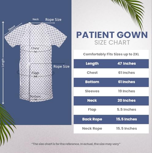 - 4 Pack Unisex Patient Gowns - The hospital gowns come in a four-pack that suits both men and women upto the size 2XL. Measuring overall length 47", Chest 61" & Bottom 61" with sizeable sleeves and neckties helps in preserving the modesty of its wearer while making it trouble-free to wear and change.