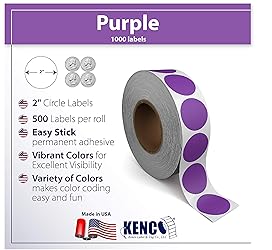 - 2" Diameter Circles, 500 Stickers Per Roll. Proudly made in the USA by Kenco Perfect for coding, sealing products and envelopes, and for adults and kids of all ages! Permanent adhesive will stick to glass, cardboard, plastic, metal and clothing. Whether organizing products, books, files, or creating your own organizational system, these labels have you covered! With a mixture of brights, pastels, and foils, we have 12 great colors to choose from - that's one for each month! Proudly made in the USA by Kenco, a third generation family business. Kenco strives for best in class product and support.