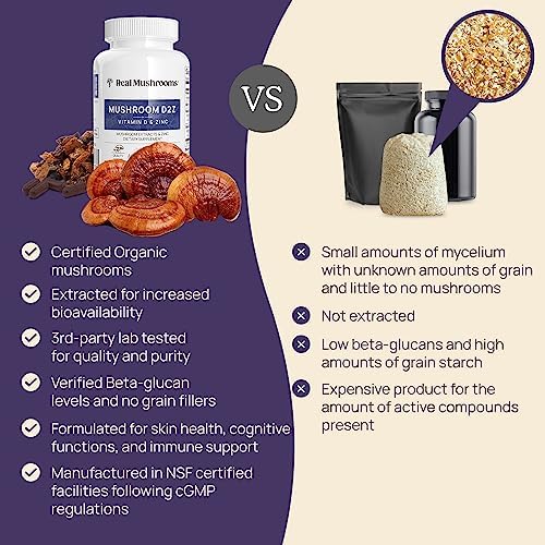 - Suplemento de vitamina D2 y zinc para apoyar la inmunidad: Real Mushrooms D2Z es un suplemento de apoyo inmunológico versátil que se obtiene únicamente de ingredientes cuidadosamente seleccionados. Cada porción tiene como objetivo brindar los nutrientes necesarios para un mayor apoyo de defensa, además de promover una mejor piel, huesos y dientes más fuertes.