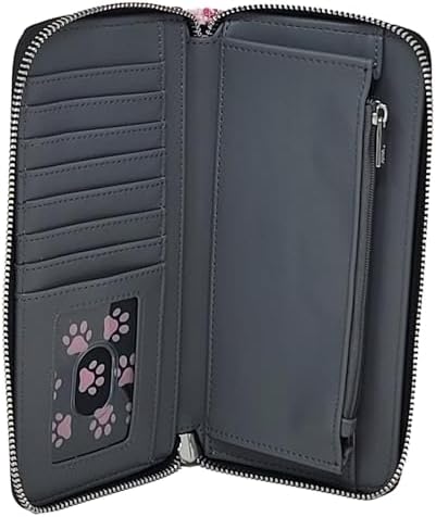 Loungefly clutch wallet with Disney Cats all-over print - officially licensed. Disney Cats are Figaro (Pinocchio and later Minnie Mouse's cat); the Cheshire Cat (Alice in Wonderland); and Marie, Toulouse, Berlioz, Duchess & Thomas O'Malley (The Aristocats). Note that the placement of the all over print does vary from wallet to wallet - around the edges, some cats may be cut off. Zip around opening and interior has a zipper pocket. It is made of faux leather with print lining and silver-tone zippers. In addition to the zipper pocket (coin pocket), there are three slot pockets the length of bills (paper money), seven slot pockets the size of credit cards and one slot pocket with a window for an ID. It measures approximately 8" x 4" x 1".