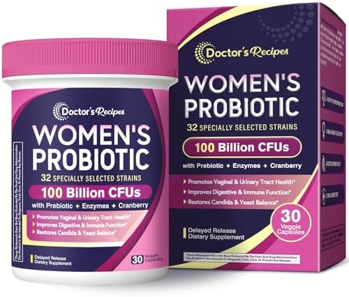 Recetas del Doctor Probióticos para Mujeres, 100 Mil Millones de UFC 32 Cepas, con Fibra Prebiótica, Enzimas y Arándano, Vaginal, Urinaria, Digestiva e Inmune, Sin Levadura, Estable en Estante, Liberación Diferida, 30 Cápsulas