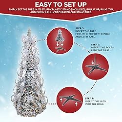 STORAGE BAG INCLUDED – Transform your home or office space into a magical winter wonderland effortlessly with our Flocked Pre-lit 1 Minute Christmas Tree. With a simple pop-up design, it can be set up in just a few seconds, making holiday decorating quick and hassle-free. Plus, it comes with a convenient storage bag for easy packing and storage. Perfect for apartments, condos, bedrooms, and more. FULLY DECORATED CHRISTMAS TREE – Simplify your holiday decorating with ease during the busiest time of the year! Our Pull-up Snow Flocked Christmas Tree is the perfect size for any space, featuring lifelike branches and holly leaf accents adorned with 150 UL fairy lights, 54 assorted ornaments, 6 luxurious ribbons, and a huge bow topper. COLLAPSIBLE CHRISTMAS TREE – Make the end of the holiday season stress-free with our 6ft Flocked Christmas Tree! After the festivities, simply store your Pre Lighted Christmas Tree in its included storage bag, ready to shine again next year with ease. EASY TO SET UP – Enjoy hassle-free setup with our Easy Setup Snowy One Minute Christmas Tree that comes with a convenient Christmas Tree Bag. Simply set the tree in its sturdy plastic stand (included), pull it up, plug it in, and enjoy a Fully Decorated Frosted Christmas Tree that will add beauty and warmth to your holiday season. UL CERTIFIED – This 6ft Instant Pull Up White Christmas Tree is exclusively crafted by Top Treasures using PVC, metal, and wire. It is UL approved for indoor use, and measures 6 feet high, providing the perfect size for any space in your home or office.