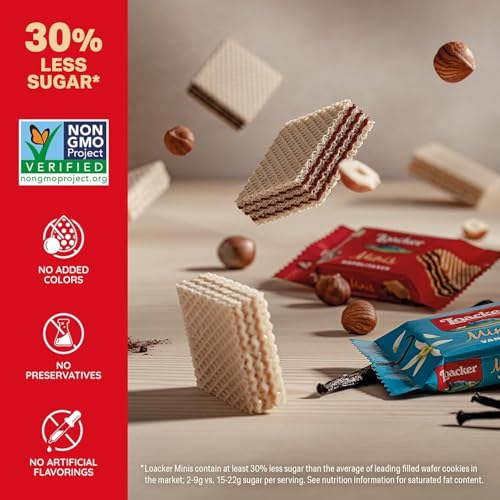 - Indulge and reward yourself with this smooth and unique wafer minis treat. It won't be easy to choose which Loacker Minis flavor to try out first: Hazelnut, Chocolate, Vanilla. You’ll love every bite of this crispy treat together with your friends while drinking coffee, or during a office break. Loacker Minis are also great as a dessert, an afternoon pick me up or even as a midnight snack. It is also a pleasant surprise in every lunchbox at work or in school or in the backpack during a hike!