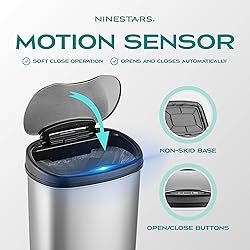 Hands-free lid opens with a simple wave of the hand, advanced infrared technology preserves battery life Large opening and capacity to handle all your household trash needs with ease, built-in manual mode keeps the lid open longer for bigger cleanups Non-skid base protects your flooring from scuff marks Removable ring liner keeps trash bag securely in place Commercial-grade fingerprint resistant stainless steel