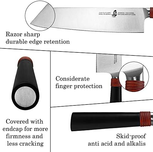 - 💫【CUCHILLO VERSÁTIL】El cuchillo Kiritsuke Ring Lite será útil en muchos casos con su hoja adecuada, ya sea que necesites cortar, rebanar, picar, trocear o mincer verduras o frutas. Ya sea en casa o en el restaurante, puede ser tu mejor asistente para ayudarte a mostrar tus mejores habilidades culinarias.