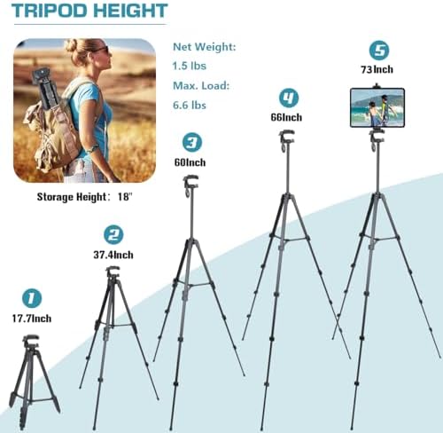- 【Trípode Ajustable de 73 Pulgadas para iPad】: Este trípode de tableta ajustable de 73 pulgadas puede ser ampliamente utilizado, apto para fotografía, YouTube, vlog, videoconferencias, etc. La altura del trípode puede ajustarse de 17.3 a 73 pulgadas (más soporte para iPad). Este trípode ligero está hecho de aluminio de alta calidad y pesa 1.6 libras, perfecto para llevar en tus viajes.