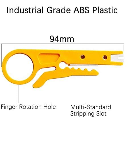 - Humanized design: The network wire stripper is with a sharp blade and a finger loop that provides a secure hold, makes it easy and safe to strip cables and punch down wires on modular connectors. Handy loop also allows you to take it on a key ring.