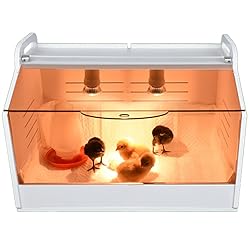 Adjustable light, transparent board for you to observe chickens. Can be opened and closed at the top, convenient to take out the chicken. Brooder box with high temperature resistant plate, Less of a fire risk, safe and strong. More suitable for 1-90 days chicks/duckling or else.The temperature control switch, the sun lamp is used to add sunlight to the chicks, and the ceramic heating lamp is used to keep the chicks warm while sleeping. Warms up to 20 chicks. The material of the brooder incubator is easy to clean, So don't worry you can't clean it after getting dirty. House structure makes insulation effect better, keeping chicks warm and cozy beneath her feathers. The cute chicken house heater, let your poultry has their own small houses. Contains: (Simple assembly is required)a brooding box, a heating lamp, 1 sun lamp, Bulb anti scalding protection net , and 2 bulb bases