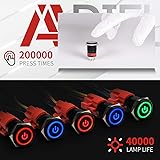 GET NEW ONE IF NOT MAN MADE BROKEN IN 3 YEARS SINCE YOU PURCHASE THE SWITCH. Brand New Black Aluminum Alloy Power Symbol Pushbutton Switch; LED voltage: 12V only, Hole size required: 0.74''/19mm Latching switch: Push it, ON; Push it again, OFF. Contact Configuration: 1NO1NC Electrical life: 200 thousand times. Mechanical life: 1,000,000 cycles High quality metal material & IP65 waterproof protection can be used in wet or dusty enviroment.