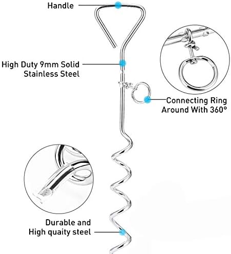 - HEAVY DUTY SPRIAL STAKE: Dog stake made of solid steel with a 360-degree Swivel ring,it also Anti-Rust.Strong enough for small to large dogs.The spiral design is specially used for sandy soil or loose ground, and is firmly screwed into the ground for worry-free installation.Help prevent your dog escaping from the yard, while also allowing it to run 360 degrees on the field.