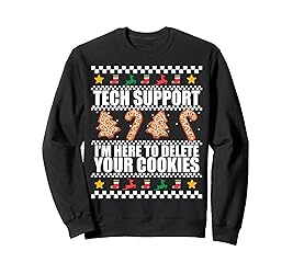 - TECH SUPPORT. I'M HERE TO DELETE YOUR COOKIES. Funny Ugly Christmas Sweater design for your favorite developer who codes all day! Features gingerbread cookies in the shape of Xmas trees and candy canes. Whether you're a professional front-end, backend, full-stack, software, or UI/UX developer, you know how easy it is to obsess over codes and programming languages. Great meme for a computer programmer, coder, anyone into web development. Click on the brand name for more funny coding memes.