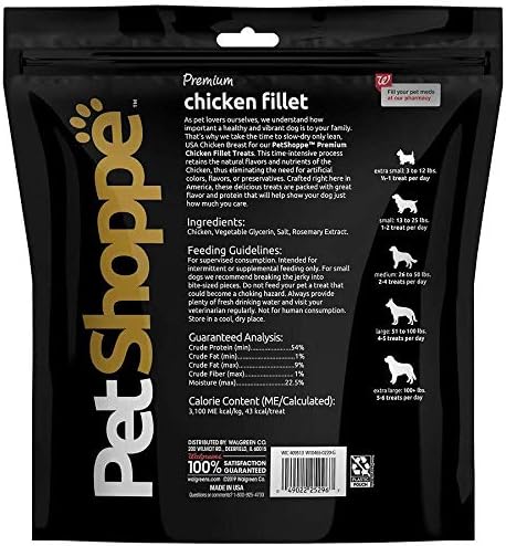 As pet lovers ourselves, we understand how important a healthy and vibrant dog is to your family. That's why we take the time to slow-dry only lean, USA Chicken Breast for our PetShoppe Premium Chicken Fillet Treats. This time-intensive process retains the natural flavors and nutrients of the chicken, thus eliminating the need for artificial colors, flavor, or preservatives. Crafted right here in America, these delicious treats are packed with great flavor and protein that will help show your dog just how much you care. Made in the USA Made with USA chicken as the #1 ingredient No corn, wheat, or soy Grain free No artificial colors or flavors No animal byproducts or added fats 100% satisfaction guaranteed Feeding Guidelines: For supervised consumption. Intended for intermittent or supplemental feeding only. For small dogs, we recommend breaking the jerky into bite size pieces. Do not feed your pet a treat that could become a choking hazard. Always provide plenty of fresh drinking water and visit your veterinarian regularly. Not for human consumption. Store in a cool, dry place. Size Lbs # of treats per day Extra Small 3 to 12 1/2-1 Small 13 to 25 1-2 Medium 26 to 50 2-4 Large 51 to 100 4-5 Extra Large 100+ 5-6
