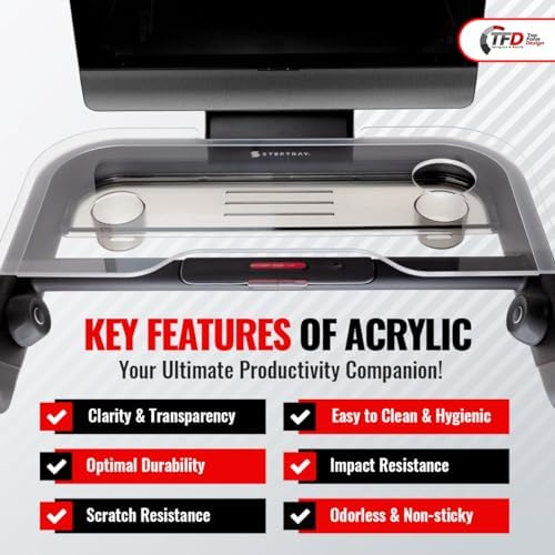 • The Steptray: Kick your productivity into high gear (COMPATIBLE WITH PELOTON TREAD PLUS ONLY, DOES NOT FIT SMALLER TREAD)! The original multi-tasking accessory for your Peloton Tread, The StepTray by TFD seamlessly turns your compatible treadmill into a functional dual-purpose workstation—work, meet, read, or watch TV while you walk or jog. This supportive acrylic tray table fits onto your handlebar and is the perfect laptop tray or holder for your tablet, phone, books, and more