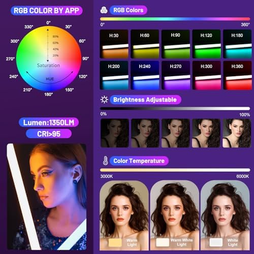 - 【APP Intelligent Control】120cm RGB LED Video Light, through APP, you can connect mobile phone and this light, switch various scene modes with easy operation.Provides RGB full color,you can not only get the fill-in light with various colors through the remote control touch pad,but also choose your own unique color through the color palette on the mobile phone APP.