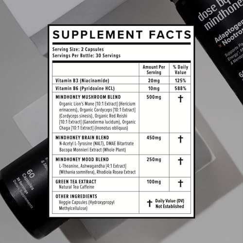 MINDHONEY | DOSE 60 Count, Premium All-in-One Nootropic Brain Supplement | Focus, Mood, Energy, & Memory | Functional Mushrooms & Adaptogens - Lion’s Mane, Ashwagandha, L-Theanine, Bacopa, & Vitamins