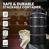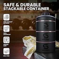 - Upgrade the way you snack, store, and stay fueled with the SHAKESPHERE Stackable Snack Containers in elegant Rose Gold. Whether you're headed to the office, gym, or on a weekend getaway, this compact and stylish solution helps you stay organized while keeping your food fresh and secure. Featuring a triple-compartment design, each pod stacks seamlessly using a smart twist-lock system, allowing you to carry just one container or all three depending on your needs. From protein powders and supplements to fruits, nuts, or small meals, this versatile solution adapts to your daily routine. The airtight, leakproof seal ensures no mess in your bag—just freshness wherever you go. Crafted with our award-winning capsule shape and smooth, corner-free interior, each container is easy to clean, with no sticking powders or lingering odors. The unique screw-cap funnel lid offers controlled pouring, perfect for mixing supplements or on-the-go nutrition. Two clear-view windows on the containers let you see contents at a glance, so there’s no guessing what’s inside. Whether you’re using it as a sleek snack organizer, a reliable protein container to go, or part of your daily meal prep routine, this system simplifies how you carry your essentials. Lightweight, durable, and portable, it fits easily into backpacks, gym bags, or lunch totes—making it ideal for commuters, fitness enthusiasts, and parents alike. Whether you're prepping meals at home or packing snacks for your next adventure, this is more than just a container—it's a lifestyle upgrade. Stay organized. Stay fueled. Stay moving—with ShakeSphere.