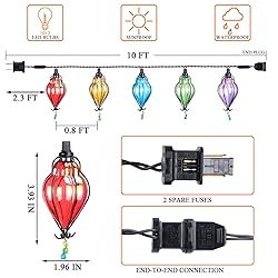 - Specification: Product Type:Outdoor decorative lights string Light Color:Multicolor Light Source: Led bulb Produt Material: Iron+Plastic Connectable: Yes (Up to 10 strands) Total Length (end to end) : 9.84 Feet Bulbs Quantity : 10+2(spare) bulbs Power Connection: Plug-In Waterproof level: IP44 Application: backyard,patio,pergola, garden, market, wedding party, Christmas trees etc. Suggested Use: Home Decor, Holiday Decoration, Party Supplies Package Included: 1* 9.84Ft Patio String Lights 2* Spare bulbs and Fuses 1* User Instruction