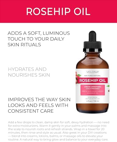 velona Rosehip Oil - 4 Fl Oz | 100% Pure and Natural Carrier Oil| Unrefined, Cold Pressed, Hexane Free | Moisturizing Face, Hair, Body, Skin Care, Stretch Marks, Scars…
