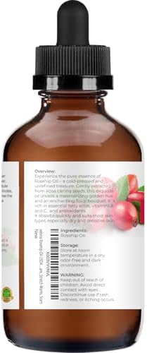 - Rosehip oil: 100% Pure and Natural. Cold pressed. Not Diluted, Non-GMO, No Additives, No Fragrance, Chemical Free, Alcohol Free, Hexane Free.