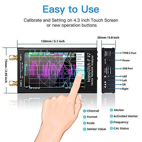 - 【4.3inch Large Screen】Our NanoVNA-F V2 with 4.3-inch IPS TFT LCD screen with 800 * 480 resolution, can measure S-parameter, voltage standing wave ratio SWR, phase map, group delay, Smith chart and so on. The NanoVNA V2 3ghz is equipped with touch screen paddle for easy use.