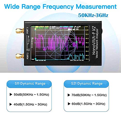 - 【Improved Frequency Range】The 3g NanoVNA-F has a measurement range of 50k-3ghz, which is larger than the old version. The TX/RX method can measure the complete S11 and S21 parameters,S21 dynamic ranges: 70dB (1.5GHz), 60dB (3GHz); S11 dynamic ranges: 50dB (1.5GHz), 40dB (3GHz).