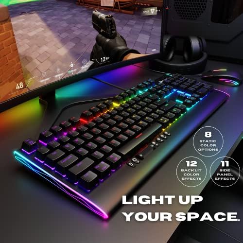 - (Ilumina tu espacio): con 12 efectos de iluminación para las teclas y los paneles laterales combinados con 4 niveles de brillo, puedes ajustar este teclado RGB para juegos para que se adapte perfectamente a tu configuración.