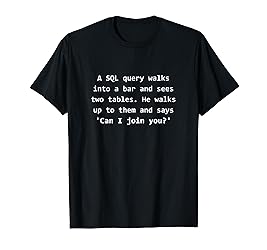SQL Programmer Computer Science Joke Funny. This will make all database experts laugh. Funny nerdy joke to share with your web developer friends. Best joke for nerds. A SQL query walks into a bar and sees two tables. He walks up to them and says 'Can I join you?' Lightweight, Classic fit, Double-needle sleeve and bottom hem