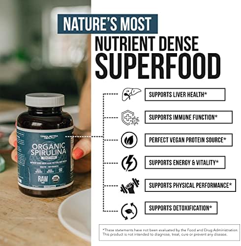 - ESPIRULINA MÁS POTENTE Y DENSA EN NUTRIENTES: Nuestra espirulina tiene el perfil de nutrientes más robusto y potente, que le proporciona la máxima nutrición con cada tableta. Consulte nuestras imágenes para ver un desglose completo del contenido de nutrientes. SOLO ESPIRULINA CERTIFICADA RAW: Estamos orgullosos de ofrecer la única espirulina cruda certificada. Esto significa que nuestra espirulina mantiene su robusta actividad enzimática «viva», lo que hace que sus nutrientes sean más biodisponibles.