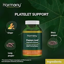 Papa ImmuneTM, our maximum potency Papaya leaf extract is synergized with TriperineTM, an exclusive extract of Ginger, Long pepper, and Black pepper to boost absorption, bioactivity, and efficacy. * Harmony Nutraceuticals offer 120 Vegan capsules which are more than or double the average competitor. Our optimum larger capsule size with no fillers, preservatives or binders ensures utmost potency and therapeutic benefit Our larger packing size of 120 count gives you most value for your money. Valued at $ 50.00, we are offering at 26.96 including shipping. Our Clinical Grade capsules are Vegetarian. Ingredients are Pure, Kosher, Halal, Organically Grown, Fair traded, Ethically Sourced. Non-GMO with no soy, no dairy, no eggs, no nuts, no gluten, no salt, no sugar, no artificial colors, no artificial flavors, no artificial sweeteners.