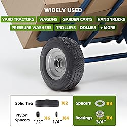 AR-PRO 2.50-4" SOLID WHEEL ASSEMBLIES - These Solid PU Run-Flat tire and wheel assemblies are the perfect replacement parts for wheeled equipment with wheels that have an outer diameter of around 8 inches, rim diameter of 4 inches, and tire width of 2.50-3 inches, 2.2 inches offset hub. load capacity of 400 lbs. 8" SOLID TIRES AND WHEELS FOR UTILITY EQUIPMENT - 10 Inch solid wheel highly compatible with yard tractors, wagons, garden carts, hand trucks, dollies, trolleys, pressure washers, and more! Convert now to more efficient and maintenance-free tire and wheel assemblies! (Please note: Not suitable for long-term static parking.) 5/8" BEARINGS AND FREE ADAPTER KIT 3/4" BEARINGS AND SPACERS - The wheel assembly has an axle borehole inner diameter of 5/8 inch that will universally fit on 5/8-inch axles. Each pack includes 3/4 inch bearings * 2; 1/4 inch long spacers * 2; 1/2 inch long spacers * 3; and metal spacers * 2. HEAVY-DUTY SOLID PU TIRE AND WHEEL ASSEMBLIES - The layered 100% premium PU ensures that the rubber tires can perform excellently under heavy-duty applications. The solid and durable construction ensures that the tires are puncture, tear, wear, and rot-resistant. The rims are steel with solid metal hubs that resist impact cracks and suitable for all-terrain use. SAFE AND COMFORTABLE TUBELESS TIRES AND WHEELS - Sharp debris and punctures are no issues for these flat-free solid rubber tires. Not only that, they can perform on terrains where pneumatic tires can easily fail. They are best for utility equipment that operates on rough terrain and requires rough handling. There’s no risk of flats, explosive punctures, and pinched inner tubes!