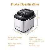- This bread maker is NOT applicable to the areas with a voltage of 230V (such as UK and EU) 19-in-1 Versatility 1. Basic / 2. Rapid / 3. Gluten Free / 4. French / 5. Cake and Quick Bread / 6. Whole Wheat / 7. Oatmeal / 8. Rye / 9. Multigrain / 10. Sweet / 11. Sugar Free / 12. Low Carb / 13. Dough / 14. Sourdough Starter / 15. Yogurt / 16. Jam / 17. Knead Only / 18. Rise Only / 19. Bake Only (Using the 17, 18, 19 menus, you can manually control the kneading, rising and baking time to make a homemade bread according to your personal preferences). 2 Loaf Sizes: 1.5 LB and 1 LB (Come with the recipes that we developed specifically for 1.5 LB and 1 LB bread). 3 Crust Colors: Light / Medium / Dark More Ingenious Design The 15-hour delay timer function allows you to get a hot and fresh loaf at a desired time. The essential functions take care of your baking process: 1-hour automatic keep warm feature, 15-minute power failure backup feature and audible reminder for adding extra fruits and nuts. Safety Foremost In Mind This Briskind bread machine has a grounding plug for safety purposes, conforms to UL relevant standard and certified to CSA relevant standard. Product Specifications Dimensions: 12 x 9 x 10.5 inches (30.5cm x 22.8 cm x 26.6 cm) Rated Input Voltage: 120V AC, 60hz Rated Input Power: 500 Watts Weight: 7.8 lbs (3.5 kgs) Come with 2 years limited warranty Accessories Included Nonstick Bread Pan*1 Nonstick Kneading Paddle*2 Measuring Cup*2 Measuring Spoon*2 Kneading Paddle Removal Tool*1 Instruction Booklet (Includes Recipes and Baking Tips)*1
