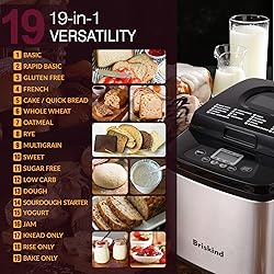 Briskind 19-in-1 Compact Bread Maker Machine, 1.5 lb / 1 lb Loaf Small Breadmaker with Carrying Handle, Including Gluten Free, Dough, Jam, Yogurt Menus, Bake Evenly, Automatic Keep Warm, 3 Crust Color