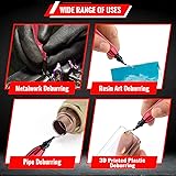 - This deburring kit by AFA Tooling is the ideal solution for all your deburring related tasks. The kit consists of 1 hand held deburring tool with a blade. Additionally, there are 10 extra blades provided. This plastic cutter tool is a great addition to add to your 3D printer tools set.Our metal cutting tool is the perfect chamfer tool to help with reaming, chamfering and burr removal. The sheet metal deburring tool kit is the perfect deburr tool for you! The tool easily holds all heavy-duty, 3.2mm, swivel head blades. Suitable for home use, plumbing applications or as a professional workshop tool. For example, you can use it for removing burrs from cut pipe, tubing, conduit, and PVC tubing thus making it a great pipe deburring tool. The tool can be used for cross holes, deep holes, straight edges and curved edges. The small size of the tool makes it really easy and convenient to carry around. The blade is easily replaceable and with multiple blades at your disposal you can carry out deburring with ease and precision. The pack of 10 blades comes in a handy plastic storage case. Unlike the regular blades that are made of carbon steel and have shorter life span, these blades are made with tempered high-speed steel and have 80% longer lifespan than the regular ones. Our debur tool is the perfect resin trimmer tool and can be used as a pneumatic deburring tool for metal.This deburring tool kit works for steel, copper, aluminum and plastic.Product Specifications for Tool:Length: 150mmDiameter: 12mm Weight: 50gProduct Specifications for Blades:Length: 47mmWeight: 42g Material: M2 HSSHardness: 62-64Rc