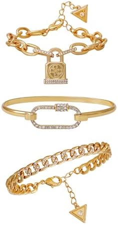 Add a touch of glam to your wrist with this stunning GUESS Gold-Tone 3 Piece Mixed Chain Bracelet Set. The set includes three gorgeous gold-tone bracelets, each with a different chain design that is perfect for layering. The bracelets are intricately designed with unique chain patterns and have adjustable lengths for a comfortable fit. The GUESS logo charm adds a touch of elegance to the bracelets and makes them perfect for everyday wear or for special occasions. This bracelet set is versatile and can be worn together or separately for a more subtle look. It also makes a great gift for someone special in your life.