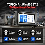 2026 New V2.0 Bidirectional Scan Tool: TOPDON AD800BT 2 adds bidirectional control function, which allows the diagnostic equipment to send instructions directly to the ECU, control the actuators and perform corresponding actions, which can help users locate problems more accurately during maintenance. Covering lights, door locks, windows, wipers, mirrors, and more in vehicle components 28 Hot Reset Services: Enjoy pop-up guidance for easy access to 28 most popular maintenance services in this diagnostic tool: Oil, SAS, EPB & Tire Pressure Reset; Injector Coding; SAS Calibration; ABS Bleeding; DPF Regeneration; Battery, Throttle, Headlight; EGR Adaption; Tooth Learning; Sunroof Initialization. *Menus vary by make, model, and year of gasoline or diesel engine vehicle. Email us your VIN data All Systems Car Scanner, Autoauth for FCA Gateway Access: This TOPDON diagnostic scanner can get OE-level analysis of ECM, ABS, airbag, SAS, DPF, EVAP, TPMS, BMS, EPB, among other available on-board systems. Pull, clear their codes; turn off related warning lights; check freeze frame data; view live stream in detailed text, merged graph you need to diagnose, repair, and maintain for majority of car makes and models worldwide. Bluetooth +AUTOVIN + 64G ROM +2 Years Free Update: Experience no strings attached wireless diagnostics with long working range of 33 feet (10m) thanks to the included Blue-tooth 4.0 VCI dongle. Automatically identify vehicle’s make, model, year information, and quickly match the right software at a single touch upon this scan tool, with a full, clear, and accurate report automatically generated for further analysis. *AutoVIN doesn’t work on ALL cars. Feel free to enter the VIN data manually The most wide-applicable Diagnostic tool + Work on 96 Vehicle Brands: This TOPDON AD800BT 2 OBD2 scanner is one of a necessary scan tool for Technician and DIYer. It fits for Technician, advance DIY, garage, car dealer, used car dealer, auto repair shop, automotive engineer, diagnostic tech, automobile tech, home mechanic, automotive student, backyard mechanic, retired mechanic, weekend DIY, individual.It compatible with OBDII-equipped vehicles built after 1996, and it works on 96 Vehicle Brands Package Contents of Diagnostic Scanner: 1 x TOPDON ArtiDiag800BT 2 Diagnostic Tool; 1 x VCI dongle; 1 x Protective Case; 1 x Power Adapter; 1 x USB C Cable; 1 x User Manual; 1 X Password Letter.*All items we sent to Amzon warehouse are Brand New,If you have received a used or wrong diagnostic tool, please contact us in time and we will solve it for you If you are not pleased with your AD800BT 2 and choose to re turn it, please kindly mark it unsellable to avoid an used one is resold again to other customers