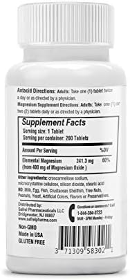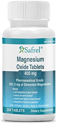 Suplemento de Vitaminas y Minerales. Tabletas de Óxido de Magnesio Safrel 400 mg. Descripción: Cada tableta contiene: Óxido de Magnesio [Equivalente a 241.3 mg de magnesio elemental (19.86 mEq)] 400 mg. Tabletas de Óxido de Magnesio 400mg por porción. Forma concentrada de magnesio para una absorción óptima. El magnesio es esencial para la función saludable del corazón, los músculos y el sistema nervioso y ayuda en la absorción y utilización de otros nutrientes incluyendo calcio y fósforo. Se cree también que el magnesio ayuda a aliviar los calambres en las piernas y los músculos. La imagen mostrada es solo para fines de visualización. El paquete real varía.