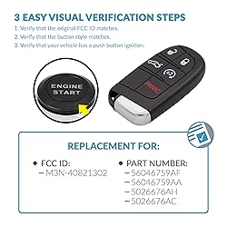BUILT WITH LATEST TECHNOLOGY PROXIMITY SMART KEY: Start your engines and enter your vehicles using our FCC ID Registered Keyless2Go New Replacements for Smart Proximity keyless entry remote keys. These are brand new high-quality hands-free proximity replacements for select vehicles with push-button ignition access. Replace your lost or broken remote key quickly and easily with this FCC Registered Keyless2Go Proximity Smart Key. REMOTE SAFETY FEATURE: Unlock your car doors quickly and get in your car much faster, scare off thieves or other suspicious people by hitting the panic button on your keyless entry remote. The ignition remains immobilized unless the right code is transmitted. The code changes after every transmission. The Remote Keyless Entry (RKE) is built in with a long-range antenna to transmit signals to the vehicle. PROGRAMMING INFORMATION: This smart key remote replacement fob must be programmed by a qualified locksmith or dealership. Free tech support is included with every purchase to help troubleshoot. We also have an expert tech on standby for any questions regarding your purchase. "Add-to-cart" to buy it now while supplies last! COMPATIBLE WITH AN FCC ID: M3N40821302 and PART NUMBERS: 56046759AF, 56046759AA,A5026676AH, 5026676AC. For full complete list, please check our product description. Each smart proximity key replacement comes with batteries, it is fully installed and is pre-tested to ensure quality and superb performance functionality. This Smart Key replacement is compatible with a selection of vehicles, you may check the vehicle fitment tool above and description for exact match. MAKES THE PERFECT THOUGHTFUL GIFT FOR HIM & HER FOR ALL CAR ENTHUSIASTS: For men, for him, for her, friends, boyfriend, father. Across occasions: new car, travel, promotion. Obtain for Father's Day, Mother's Day, Veteran’s, Christmas, Thanksgiving, New Year. Gift one for yourself as backup, this proximity remote is trustworthy and reliable. 100% SATISFACTION RISK FREE PURCHASE WITHIN 30 DAYS: If the remote does not hold up for any reason, simply contact us for a refund or replacement.