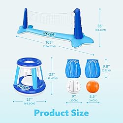- SUMMER/JOYIN Summer Inflatable Basketball & Volleyball V5 Toy Set with 2 Weight Bags, an Inflatable Basketball Hoops, an Inflatable Volleyball for Kids Adults Swimming Summer Toy Pool Games, Pool Toys, Pool Sports SUPER VALUE. Our summer toy set includes an Inflatable Volleyball Court with 2 Weight Bags, an Inflatable Basketball Hoops, an Inflatable Volleyball, and 2 balls for basketball & volleyball. The volleyball court measures 105'' x 28'' x 35'', 27'' x 23'' x 27'" for Basketball hoop, 17" x 26" for each of the weight bags, 9" diameter for volleyball ball, and 6" diameter for the basketball ball. Perfect summer toys!REAL FUNCTION. The 2 weight bags are used for the inflatable volleyball court as an anchor so it would stay in place without unnecessary movements while playing. Kids and adults can now use this summer toys set as this is not only limited to 1 game, they could play volleyball or basketball, whichever they like! simply inflate the toys and beat the heat this summer!IDEAT GIFT & TOY. Perfect Summer Essentials for Friends and Family Gatherings, adults and kids! Ideal as well for Outdoor Decorations, Pool Essentials, Pool Parties, and Fun Activities For Summer. PREMIUM QUALITY. Nontoxic and made from durable High-Quality Raft Material to ensure long lasting and leak proof usageProviding a great shopping experience is our main priority to our customers. Feel free to message us through “contact sellers” if products don't meet your expectations. The celebrations start at JOYIN!