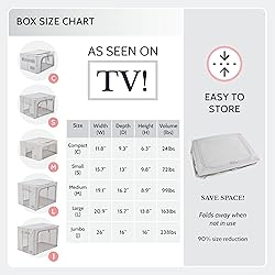 - These 2 packs of Periea home storage boxes are perfect for storing bedding or clothes, keeping their contents dust free. You will be able to see exactly what is stored in each via the clear front window and zip opening fronts and tops will allow you to easily add and remove items. These organizers are certified to hold up to 44lbs and have folding steel frames, so you can be confident that even when full they will stay solid. The enclosed MDF base is sturdy and durable and a stainless-steel internal frame which folds out to keep the box's shape but also means that it can be folded down to 3% of the total size and stored away easily when not needed. These home storage boxes are IPX4 certified splash proof. You can stack these boxes and the sturdy side handles mean you can easily move them from the wardrobe and the small plastic side pocket means that you can add your own label of the contents. Pack of 2 Dimensions: Jumbo - W26” x D 16” x 16” Large - W20.9" x D16.2" x H14" Medium -W19.1" x D16.2" x H8.9" Small -W15.7" x D13" x H9.8" Compact: W11.8" x L9.3" x H6.3" Made from PE, stainless steel and MDF.