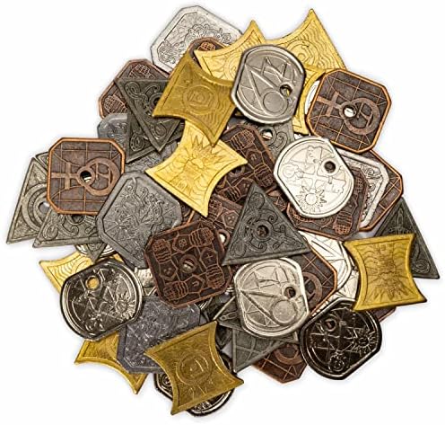 - Monedas de Metal Sólido y Bolsa de Vellón: Hechas con metal sólido chapado real con una pátina auténtica y desgastada por el tiempo para fomentar la inmersión y vienen con una bolsa de vellón con emblema real. Hemos incluido una útil tabla de tasas de cambio para que puedas implementar las monedas en tu juego directamente desde la caja