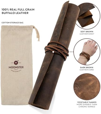 Moonster Genuine Leather Sheets for Crafts, Tooling Leather Sheet 12"x24" – Full Grain Buffalo Leather Fabric, Leather Crafting Kit, Veg Tan Leather for Leather Craft with 36" Cord – Soft Brown