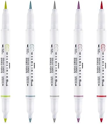 Zebra Pen Mildliner Double Ended Brush Pens help you express your unique creativity with the convenience of two sized tips in each pen. The unique mild colour of each pen provides soft hue on the page, allowing you to layer with the water resistant ink with ease. Beautiful colours don’t bleed through so you needn’t worry about the next page in your sketchbook. This 5-count set includes cool & refined tones: mild green, mild dark blue, mild gray, mild violet, and mild red. AP certified non-toxic. Keep a set of Mildliner Double Ended Brush Pens in your desk drawer, art bin or backpack for creativity at your fingertips. Create personalised greeting cards, sketch out a new idea or add dashes of precision colour to any project. Add some beauty to your bullet journal or planner. Bring a touch of colour to handmade cards, letters and art presentations. Gift your favourite budding artist with a complete set. Excellent for marking up important passages in texts. Complete your creative kit with additional Zebra Pen artists’ instruments like Sarasa Fineliners, Zensations Technical and Calligraphy pens.