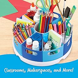 DESK STORAGE: All-in-one storage center features all the space you need to keep your classroom, playroom or office clutter free. MULTIFUNCTIONAL SPACE SAVER: Carousel-style storage center comes with eight removable containers sized for glue sticks, colored pencils, and more. GRAB & GO: Each removable container comes with an easy-to-hold handle, so you can always grab the materials you need. PROMOTE CLEANLINESS & ORGANIZATION: Big enough to hold your kids' supplies, or hand sanitizer bottles for germ free hands. Each container measures 4.5" wide x 4" tall. DURABLE & HIGH QUALITY: Containers rest within a sturdy circular tray complete with center storage space. Tray measures 12" in diameter