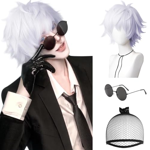 Anogol Hair Cap+(1 Black Glasses) Satoru Gojo Cosplay Wig Short Silver Fluffy Wig for Jujutsu Kaisen Cosplay Silver Mix Light Purple Men Synthetic Hair with Bangs Costume Wig for Halloween Party Anime