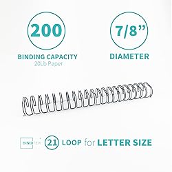 200 SHEET CAPACITY: Each twin loop binding wire measures 7/8" in diameter and 1.2mm in thickness, which can hold up to 200 sheets of 20# paper. 50 PER BOX: These binding wires are made from metal material, featuring with double-loop style to offer security, stable enough for your long-term needs. 2:1 PITCH: These double loop wires binding spines have 2 holes per inch, they are compatible with 2:1 pitch wire binding machines or the machines with disengaging pins. 2:1 PITCH: These do11 INCHES: These 21 loops double loop binding wires are designed to be used with letter sized paper, or you can bind smaller projects by cutting the over size part.uble loop wires binding spines have 2 holes per inch, they are compatible with 2:1 pitch wire binding machines or the machines with disengaging pins. BINDING WIRE: Double loop binding wires can gather your files together and organize them to keep in order, no more scattering or causing mess, ideal choice for your presentation, meeting or office. They serve as amazing gifts suitable for teachers, students, and coworkers.
