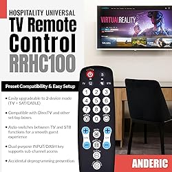 - Introducing the all-new RRHC100 Hospitality 1-Device Universal EASY-WIPE Surface Remote Control. Designed with the needs of the hospitality industry in mind, this remote control offers a host of features tailored to simplify TV control in public areas, while ensuring easy cleaning and enhanced security. - Easy-Wipe Surface: The flat membrane surface of the RRHC100 makes cleaning a breeze. With a simple wipe, you can maintain a clean and hygienic remote control, perfect for environments where cleanliness is of utmost importance. - Simplified Control: This basic-function remote control features a limited selection of over-sized buttons, making it ideal for situations that require simplified control of a television only. By removing buttons like the MENU button and other functions related to DVD players, cable or satellite boxes, accessing standard TV functions becomes effortless. - Enhanced Security: The RRHC100 offers added security with the optional cable attachment. By attaching the cable inside the battery compartment, you can protect your investments and prevent unauthorized removal or loss of the remote control. - Ideal for Hospitality: Perfectly suited for televisions located in public areas or environments where the sets are operated by children or the elderly, the RRHC100 provides an intuitive and user-friendly interface. Its design prioritizes ease of use and accessibility, ensuring a hassle-free TV viewing experience. - Wide Compatibility: The RRHC100 is preprogrammed to work with LG and Vizio TVs, as well as STB-2000 Set-top Boxes (bed code 0). This versatile remote control works seamlessly with both HDTVs and older TVs, making it a reliable choice for various setups. - Additional Features: The RRHC100 includes convenient features such as "Dash," "Sleep," "Closed Captioning," and "Previous Channel" buttons. It comes with an extensive code database and a full operating manual for easy setup and programming. Dimensions: 6.5" x 2" x 1"