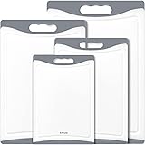 【ALL IN ONE SET】Our cutting boards of various sizes can improve your efficiency in the kitchen. Extra large size:17*11.8*0.4 inch; Large size:13.7*9.5*0.35 inch; Medium size:11.4*7.8*0.35 inch; Small size: 10*6*0.4 inch. Each size is designed for a type of food and can be cut separately. Perfect for multiple meals or all day use. 【HIGH DENSITY CUTTING BOARDS】Each of our cutting boards are made of high-density plastic, with super lastingness. The cutting board surface is tough enough to withstand heavy chopping, cutting and dicing. Will not leave stains , can be used for a long time. 【BUILT-IN JUICE GROOVE】 Four edges of the plastic cutting board is designed with a juice groove to catch liquids from flowing onto your counter, keeping the countertop beautiful at all times. And these plastic cutting boards equipped with TPR edge handle, which can be firmly fixed in place when you prepare food. And the handle design is also very convenient and easy to store. 【EASY TO WASH】You can not only rinse it directly with warm water, but also put it in the dishwasher. 【PERFECT GIFT IDEAL】Practical design and multiple sizes make these cutting boards a perfect gift for moms, friends and neighbors. Suitable for Thanksgiving, Mother's Day, Father's Day, birthdays or any occasions.
