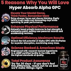 Boost Memory and Focus: Hyper Absorb Alpha GPC by RevSci enhances memory and focus, making it one of the strongest brain supplements for memory and focus; Experience a dynamic brain boost and improve cognitive function with this powerful nootropic Enhanced Absorption with BioPerine: Our Alpha GPC formula includes BioPerine for hyper absorption, ensuring your body fully absorbs this choline supplement. Enjoy the benefits of a nootropics brain support supplement designed for maximum bioavailability and effectiveness Support Physical & Mental Performance: Alpha-GPC supports the natural production of human growth hormone (HGH), enhancing strength, stamina, and recovery; Perfect for athletes and anyone seeking a memory supplement for brain and body performance Promotes Cognitive Health & Brain Clarity: Supports overall brain health by enhancing acetylcholine levels, improving mental clarity, and reducing brain fog; Ideal for maintaining youthful cognitive function Scientifically Backed & USA Made - RevSci Alpha GPC supplement is made with research-backed ingredients in a cGMP-certified facility in the USA. This brain supplement is crafted to the highest standards of quality and effectiveness, ensuring it is one of the strongst brain focus and memory supplements.